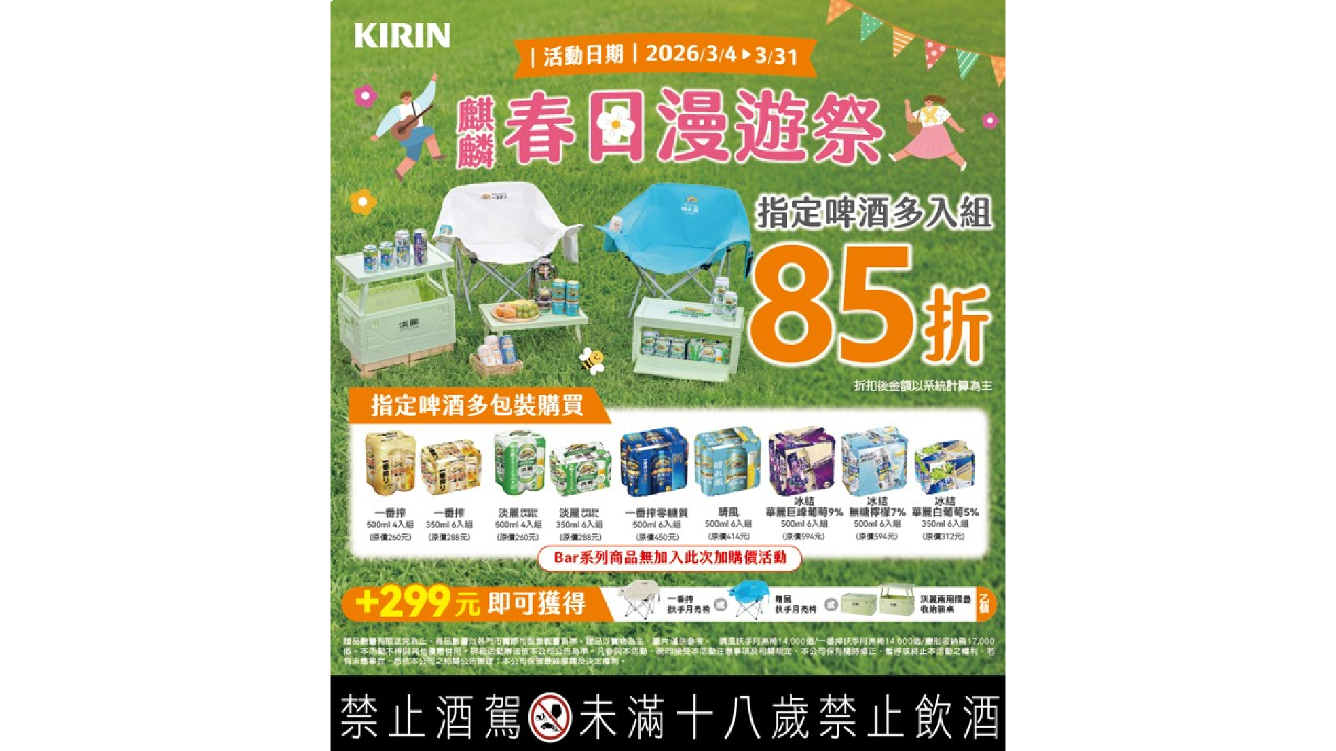 台灣麒麟(KIRIN)迎來一年一度麒麟月,推出全新主題活動「春日漫遊祭」,邀請大家放緩腳步,帶上喜愛的KIRIN酒款,在花香與微風中展開屬於自己的春日片刻。自3/4起至3/31止,於全台7-ELEVEN門市購買指定KIRIN酒款多入組,即可享85折優惠,還能加價購野餐質感裝備