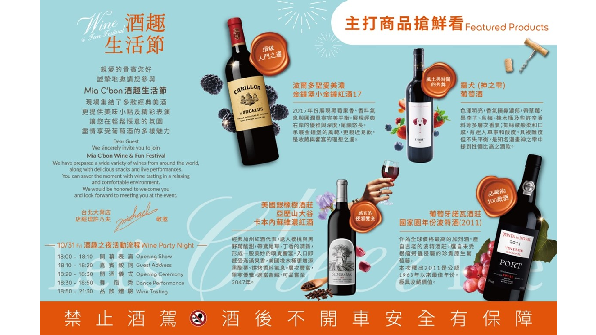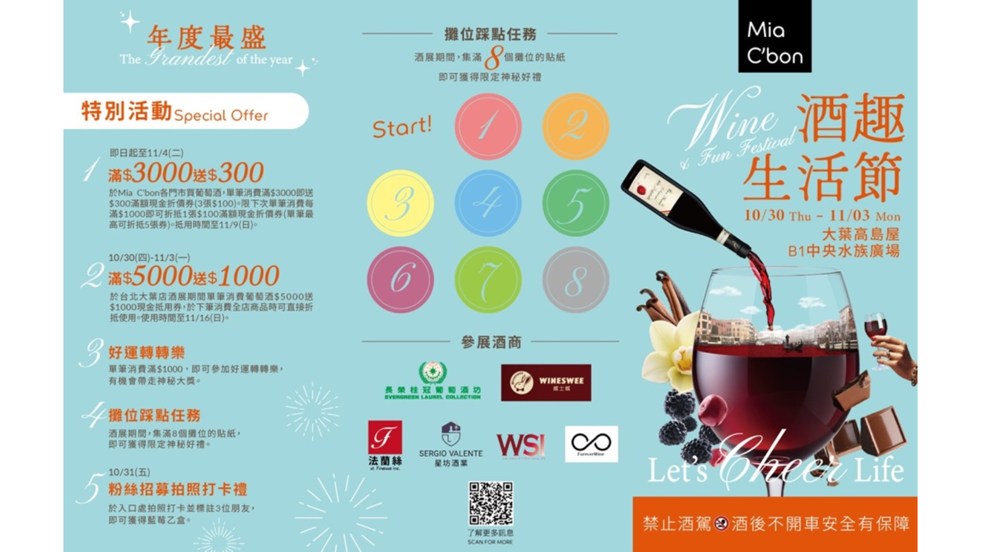 Mia C’bon台北大葉店酒趣生活節期間限定(10月30日~11月3日)優惠活動: