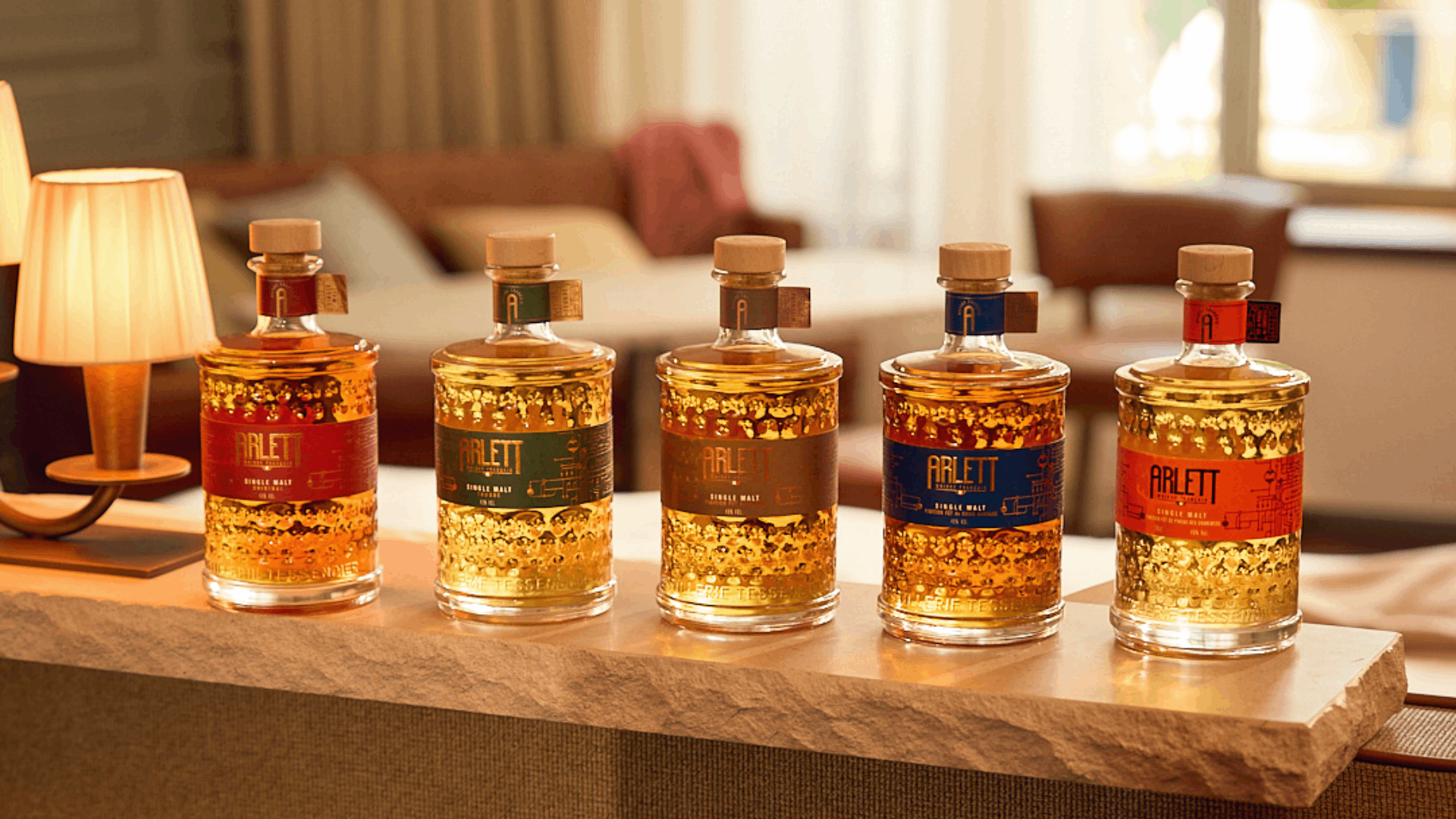 阿萊特Arlett系列包含多款風味:如單一麥芽蘭姆桶陳釀,融合熟香蕉、香草與辛香料香氣,口感濃郁帶有金色煙草與甘草餘韻;而泥煤風味款則於 100% 波本桶熟成四年,展現碘香、煙燻與泥煤的經典特色,餘韻悠長。