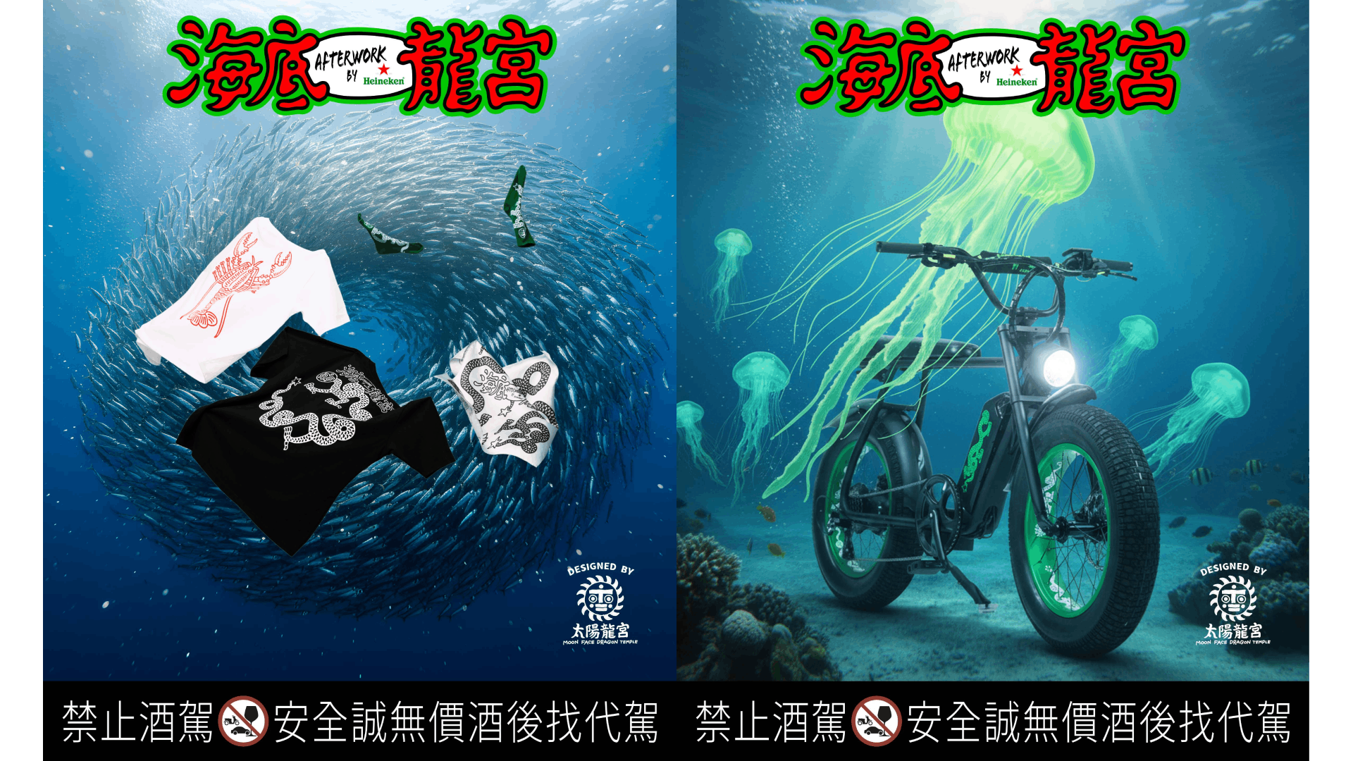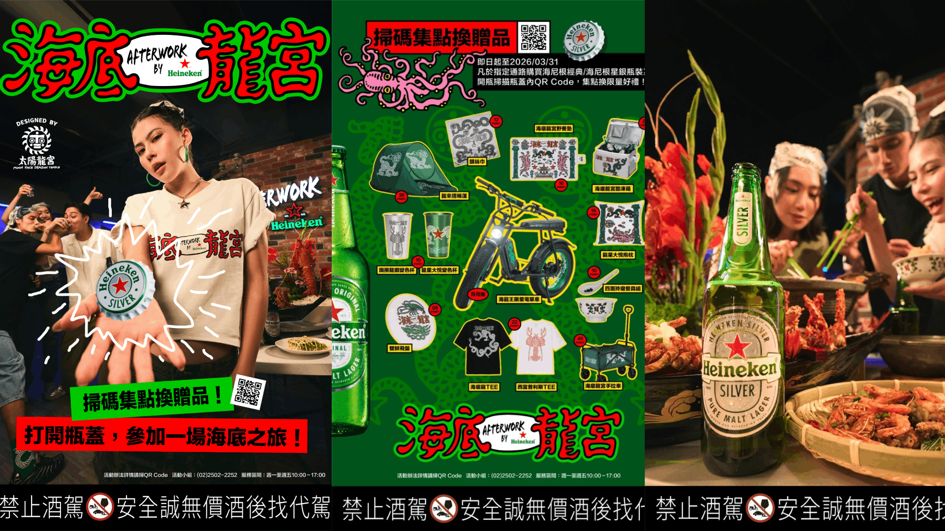 台灣獨有的熱炒文化,是社交的發生地;快速上菜與暢快配酒,早已是年輕上班族下班後的首選場域。海尼根與太陽龍宮以「虛構重塑」手法把民俗元素轉譯成潮流符號,打造前所未見的「海」底龍宮,把熱炒文化的煙火氣息拉上潮流舞台。同時,海尼根也將「負責任飲酒」融入每一場聚會節奏中;活動期間,集2點即可兌換Uber乘車優惠或台灣代駕抵用金,讓聚會從一開始就把「安全返家」納入計畫。