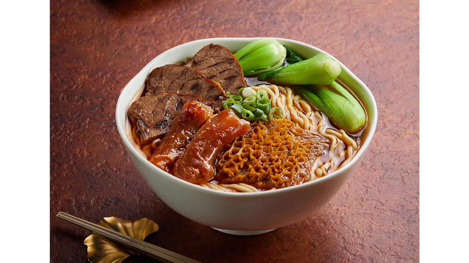 圖說:許耀光主廚首次嘗試以牛腱、牛筋、牛肚慢火熬煮,港式口味融入濃郁醇厚的台式牛肉湯頭,搭配Q彈有勁的手工拉麵,成就人生首碗「至尊三寶牛肉麵」。圖/圓山大飯店提供