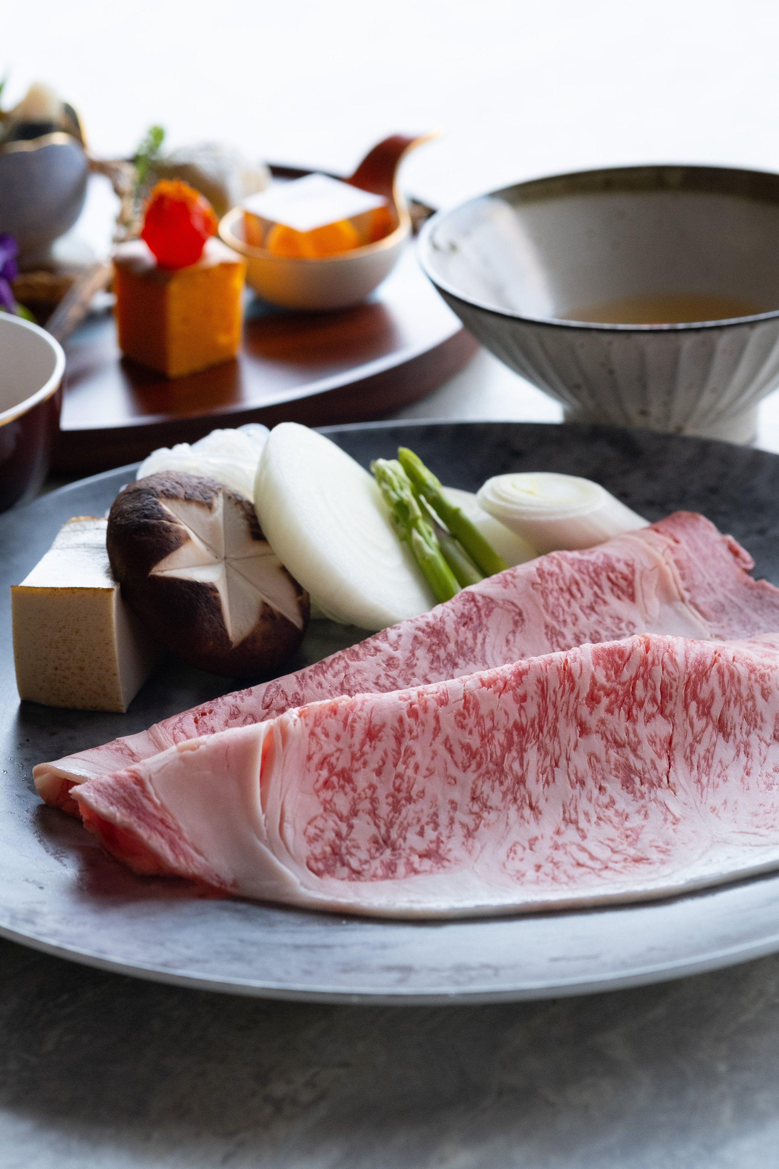 「百年之味壽喜燒」迎來套餐的美味巔峰,堅持讓饕客在絕佳時間品嘗到理想狀態,特別訂製鑄鐵鍋、壽喜燒推車,由專人桌邊服務涮烤,過程必須恪守東京本店講究的火力、溫度、順序。作為傳統關東派,使用傳承百年的秘製壽喜燒醬汁,彰顯的是日山特選和牛最迷人的油花、油質與肉質的原始風味魅力。開幕首波選以鹿兒島A5等級薩摩牛,肉片講究每片在55~60公克之間,厚度達2.5mm,才能品嚐得到和牛吸附壽喜燒醬汁,肉香交織醬汁的飽滿滋味。