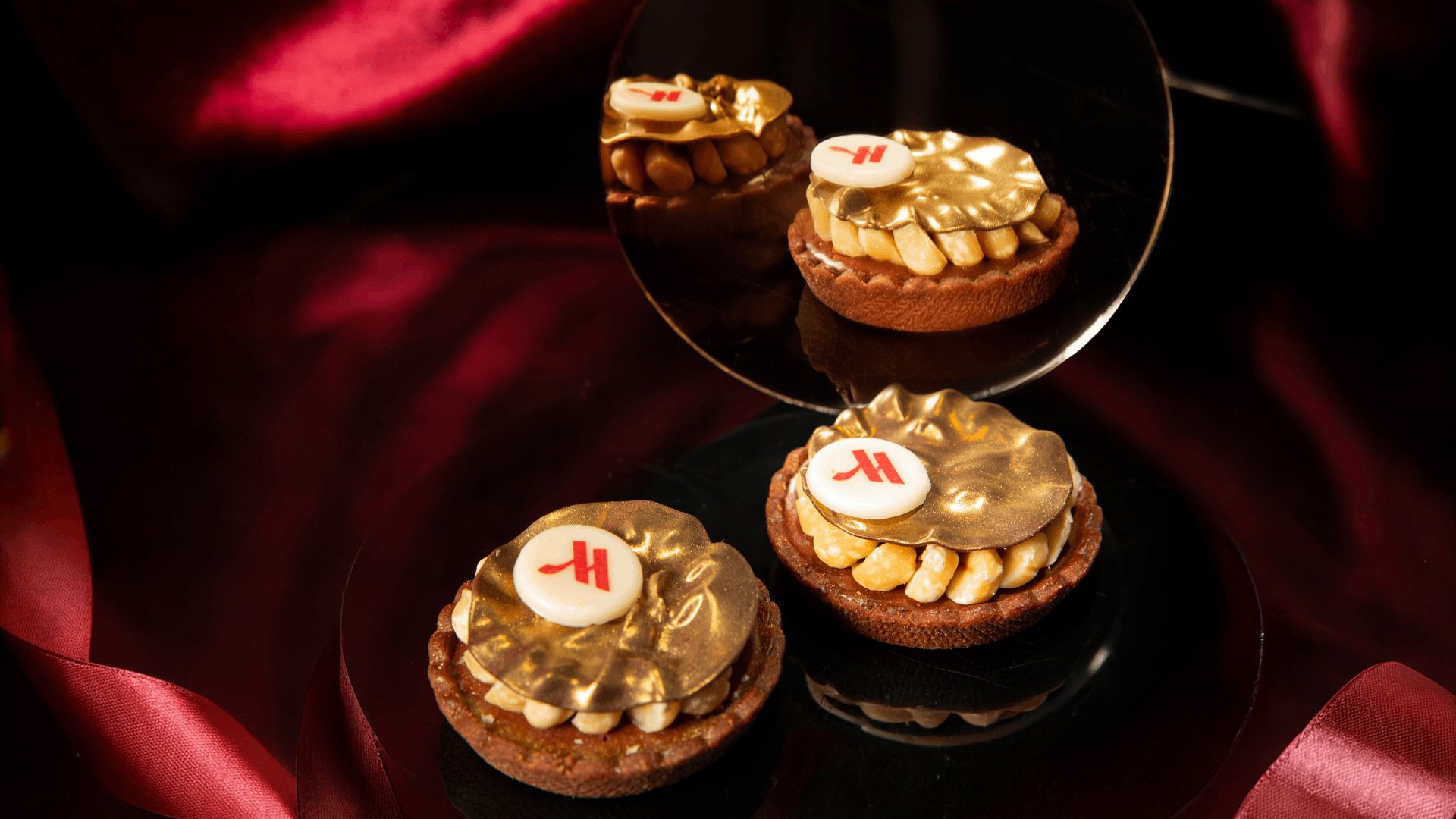 圖5. 台北萬豪「魔幻巧刻」雙人下午茶,充滿黑金華麗質感的「榛果阿澤莉亞巧克力塔」,酥脆的巧克力派皮中,填入了以35%阿澤莉亞牛奶巧克力、無糖榛果醬與大溪地香草精心調製的榛果甘納許,塔面鋪滿了金黃的烘烤榛果