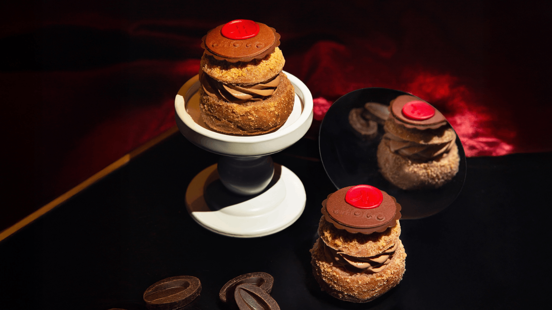 「尼昂寶黑巧克力慕斯」則是一款純巧克力甜點,底部為杏仁達克瓦茲,鋪上尼昂寶巧克力脆片及巧克力奶醬,再由細膩的巧克力慕斯溫柔包覆。入口可感受尼昂寶68%黑巧克力標誌性的微酸與柔和辛香,尾韻則嚐到淡淡的微苦滋味,風格鮮明。「莓果阿拉瓜尼巧克力蛋糕」展現濃郁深邃的滋味,濕潤的阿拉瓜尼巧克力磅蛋糕散發蜂蜜與烤麵包的迷人香氣,內餡融入酸甜的覆盆子果醬與吉瓦那巧克力胡桃甘納許、愛爾帕蔻巧克力脆片,搭配輕盈的大溪地香草香緹。「阿庇諾巧克力布里歐」則取代英式下午茶常見的司康,以鬆軟溫熱的布里歐,搭配85%高純度阿庇諾巧克力製成的濃烈甘納許,一口咬下,頂級黑巧克力的純粹苦甜與濃烈口感瞬間迸發,讓人難以忘懷。