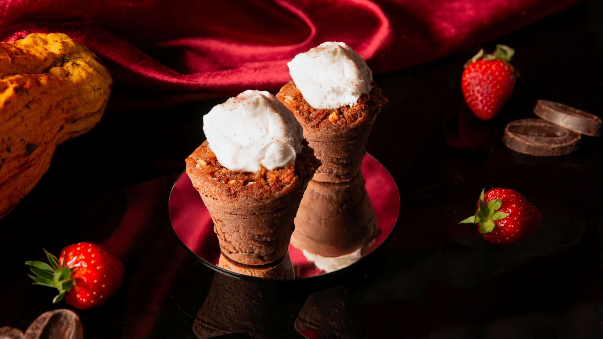 充滿黑金華麗質感的「榛果阿澤莉亞巧克力塔」,酥脆的巧克力派皮中,填入了以35%阿澤莉亞牛奶巧克力、無糖榛果醬與大溪地香草精心調製的榛果甘納許,口感絲滑細膩,榛果的溫潤香氣在口中綻放。塔面鋪滿了金黃的烘烤榛果,最後附上一片刷有金箔的巧克力薄片,宛如閃耀著古銅光澤的精緻珠寶。「孟加里巧克力冰淇淋」則是以帶有些許莓果香氣的64%孟加里巧克力製成冰淇淋,內餡包裹酸甜的覆盆子果泥與新鮮草莓丁。冰淇淋中巧妙地加入了微量朝天椒辣粉,甜中帶有辛香氣息,外層再裹上瓜那拉巧克力脆皮,口感層次豐富,令人玩味。