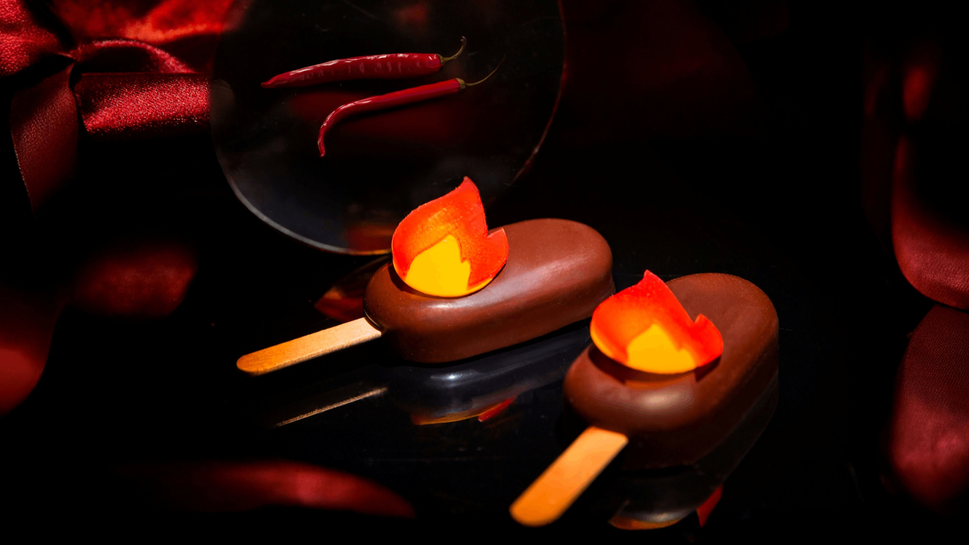 圖6. 台北萬豪「魔幻巧刻」雙人下午茶,「孟加里巧克力冰淇淋」則是以帶有些許莓果香氣的64%孟加里巧克力製成冰淇淋,內餡包裹酸甜的覆盆子果泥與新鮮草莓丁。冰淇淋中巧妙地加入了微量朝天椒辣粉,甜中帶有辛香氣息