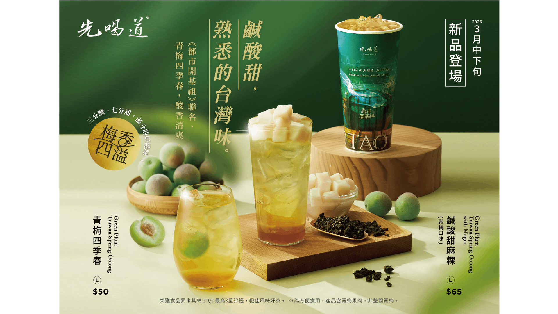 本次聯名主打飲品「青梅四季春(L)$50」,以先喝道榮獲ITQI最高三星國際風味評鑑獎肯定的「四季春茶王」為基底。茶湯清澈透亮、花香淡雅回甘,融合酸甜青梅醬後,風味層次清爽平衡,既有茶香的優雅,也有青梅的生津解膩,喚醒許多人記憶中的古早味風景。