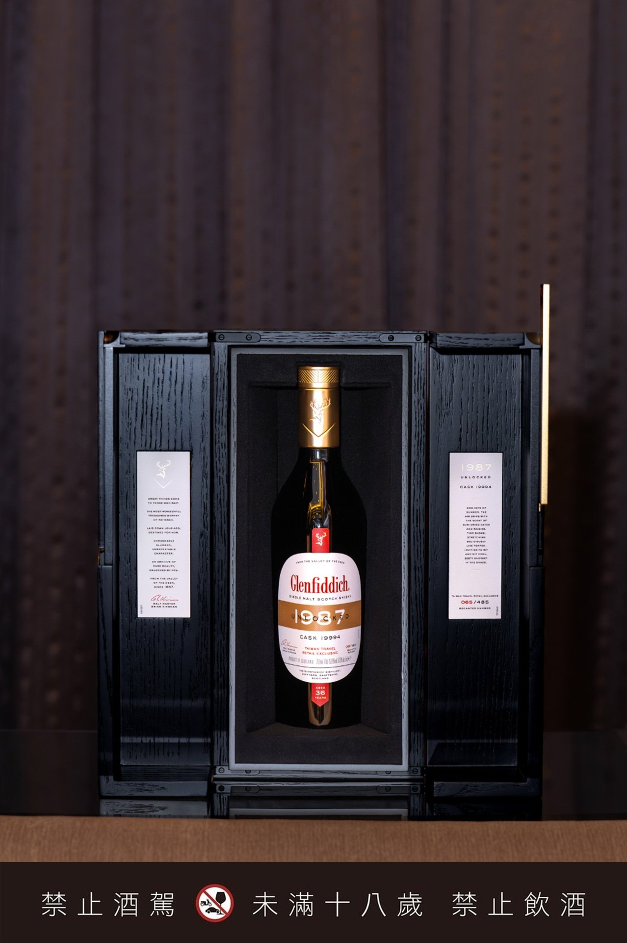 以格蘭菲迪現存最早收藏的歷史酒款為靈感,延續經典三角瓶型,象徵單一麥芽威士忌不可或缺的三大元素——大麥、水與酵母。高級無鉛水晶瓶身,搭配金色瓶蓋與封口,低調中流露細緻質感。酒標復刻1960年代的經典紅色品牌字,並標示酒桶編號與專屬瓶號,細節之中,悄然訴說這款百年紀念之作的獨特身分。珍貴黑梣木打造的收藏盒,雙開「沙龍門」設計,如同揭開一段被時間封存的故事。沉穩內斂的木質紋理,襯托出酒款的歷史份量,而酒標與盒身上限定的台灣標示與專屬瓶號,更賦予每一瓶酒唯一身份,成就無可替代的珍藏價值。