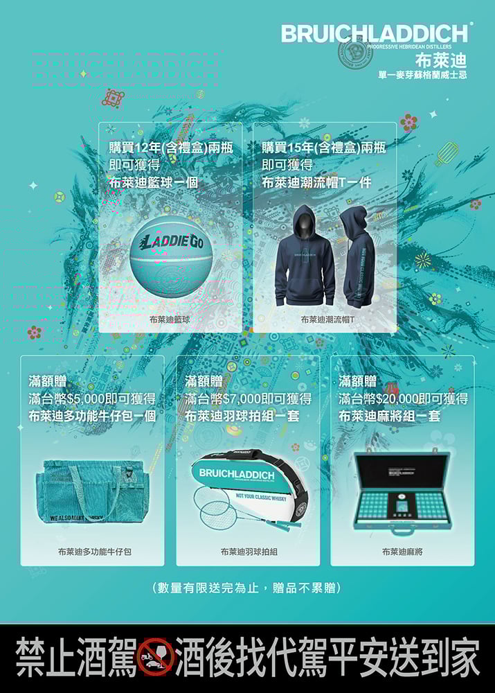 為歡慶農曆新年到來,布萊迪同步推出一系列限量贈禮活動,讓消費者在品味艾雷島風土的同時,也能收藏專屬於品牌精神的風格單品。凡購買布萊迪 12 年 (含禮盒) 兩瓶,即贈「布萊迪籃球」一顆;購買布萊迪 15 年 (含禮盒) 兩瓶,即贈「布萊迪潮流帽T」一件。