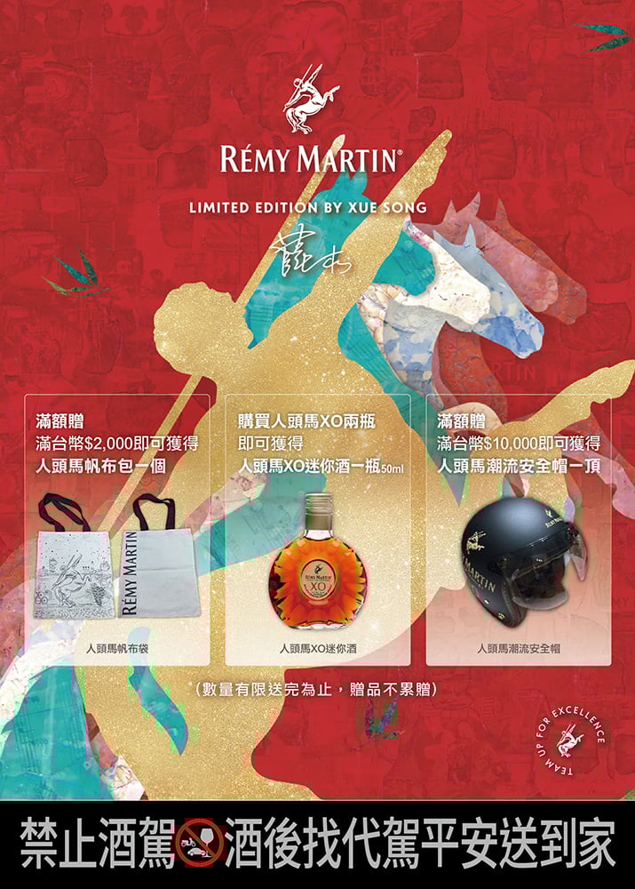 歡慶農曆新年,於限定酒專購買人頭馬新年禮盒,滿額即贈品牌帆布包、品牌迷你酒及品牌安全帽等,數量有限送完為止,詳情請洽人頭馬粉絲團/ 人頭馬君度 LINE 官方帳號。