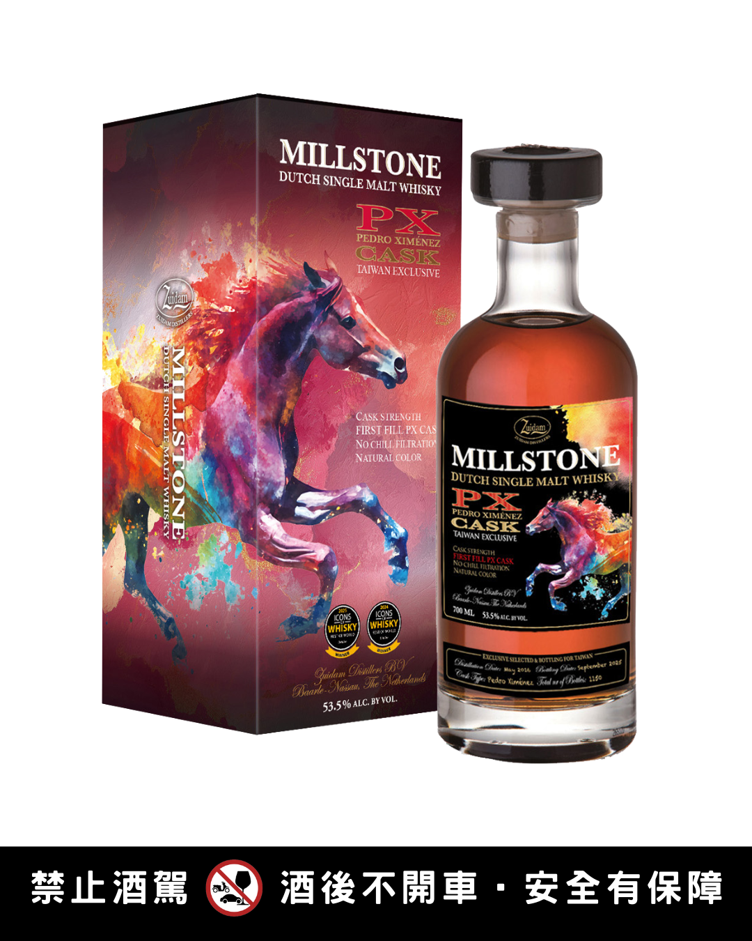 來自荷蘭 Zuidam 酒廠的米爾登單一麥芽威士忌,以風車與麥田聞名其風土精神。本次推出 台灣限定馬年紀念原酒,酒精濃度高達 53.5%原桶強度,濃郁葡萄乾、蜜餞、可可、烘烤堅果與香料氣息交織,酒體厚實卻平衡,尾韻綿長優雅。完整展現 PX 雪莉桶的濃厚風味。以奔馳駿馬為設計主軸,色彩繽紛帥氣奔放,象徵馬年勇往直前、氣勢如虹;背景呼應荷蘭麥田與釀酒原料意象,兼具藝術感與收藏價值。原酒級實力,為新年開出好彩頭。建議售價3350元