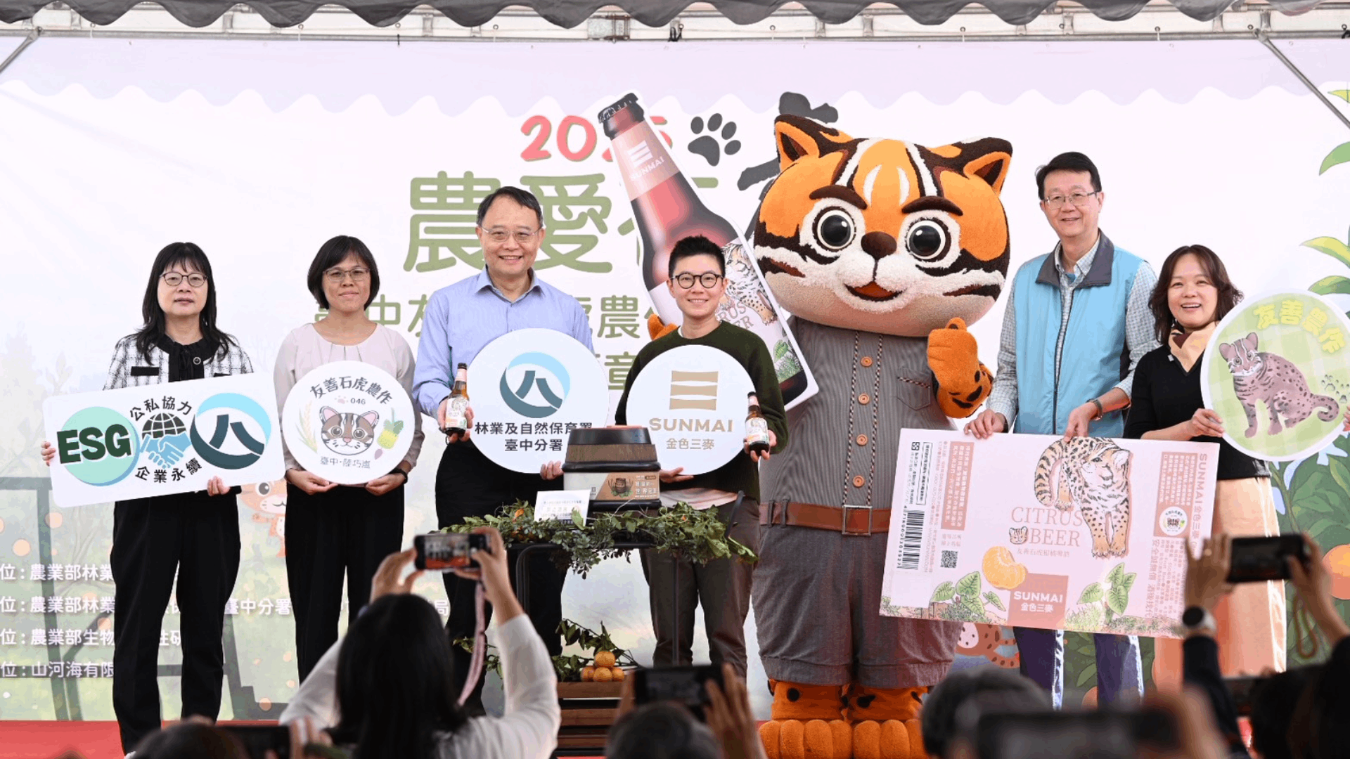圖1:SUNMAI金色三麥「友善石虎柑橘啤酒」以取得友善石虎農作標章認證的有機桶柑入酒,將台灣在地果香、清爽酒感與友善農作理念巧妙揉合,並於去年12月與林業保育署臺中分署於共同發表「Brew for Biodiversity–友善石虎柑橘啤酒計畫」。 中央著黑衣者為金色三麥釀酒師詹于慧。