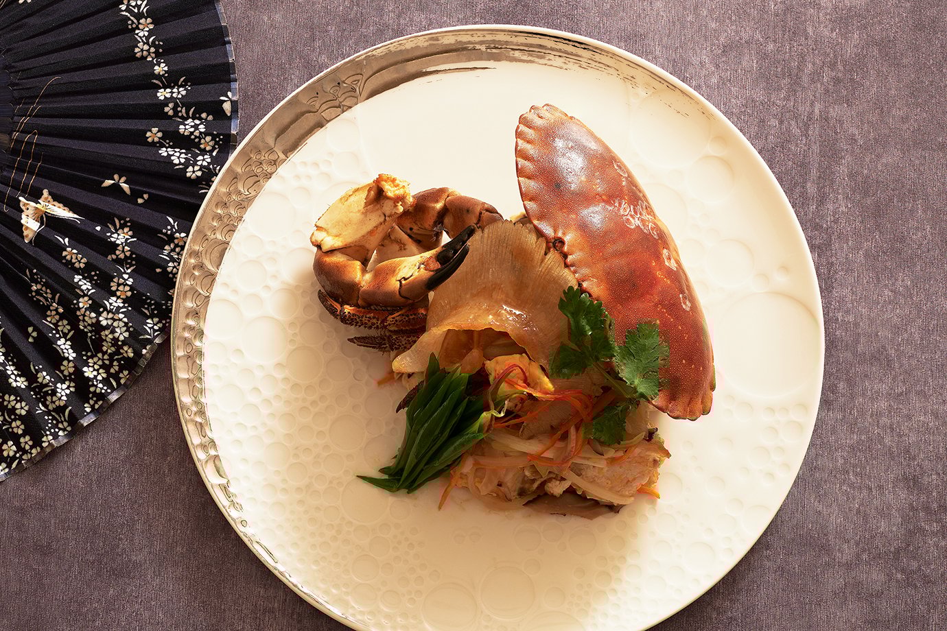 開場迎賓碟三品,以蘋果和風蟹肉、脆皮燒肉、洛神鮑魚干貝凍為序曲,清新開胃;「清蒸玉露帝王蟹」蟹腳肉襯魚露與蔥花,蒸出極致原味;「魚翅桂花麵包蟹」以整隻麵包蟹搭配魚翅、桂花與香菇絲,口感細膩豐潤;「蟹蟹平安灌湯包」則以大閘蟹黃與帝王蟹肉入餡,湯汁濃郁齒頰生香;「踏雪蟳梅飛魚飯」將紅蟳與飛魚卵、紫蘇梅巧妙結合,火候與蛋香交織出酸甜鮮美的多重風味。