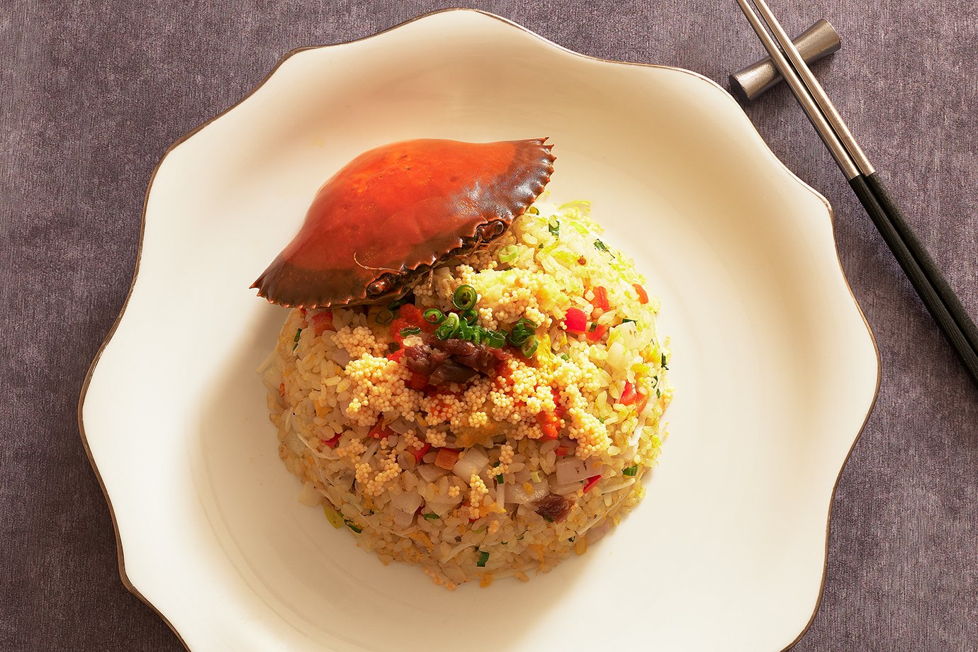 圖說5: 「蟹煮隆恩」尊饌饗宴中的「踏雪蟳梅飛魚飯」將紅蟳與飛魚卵、紫蘇梅巧妙結合,火候與蛋香交織出酸甜鮮的多重風味。(圖/ JR東日本大飯店台北)
